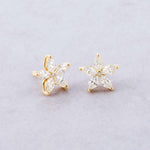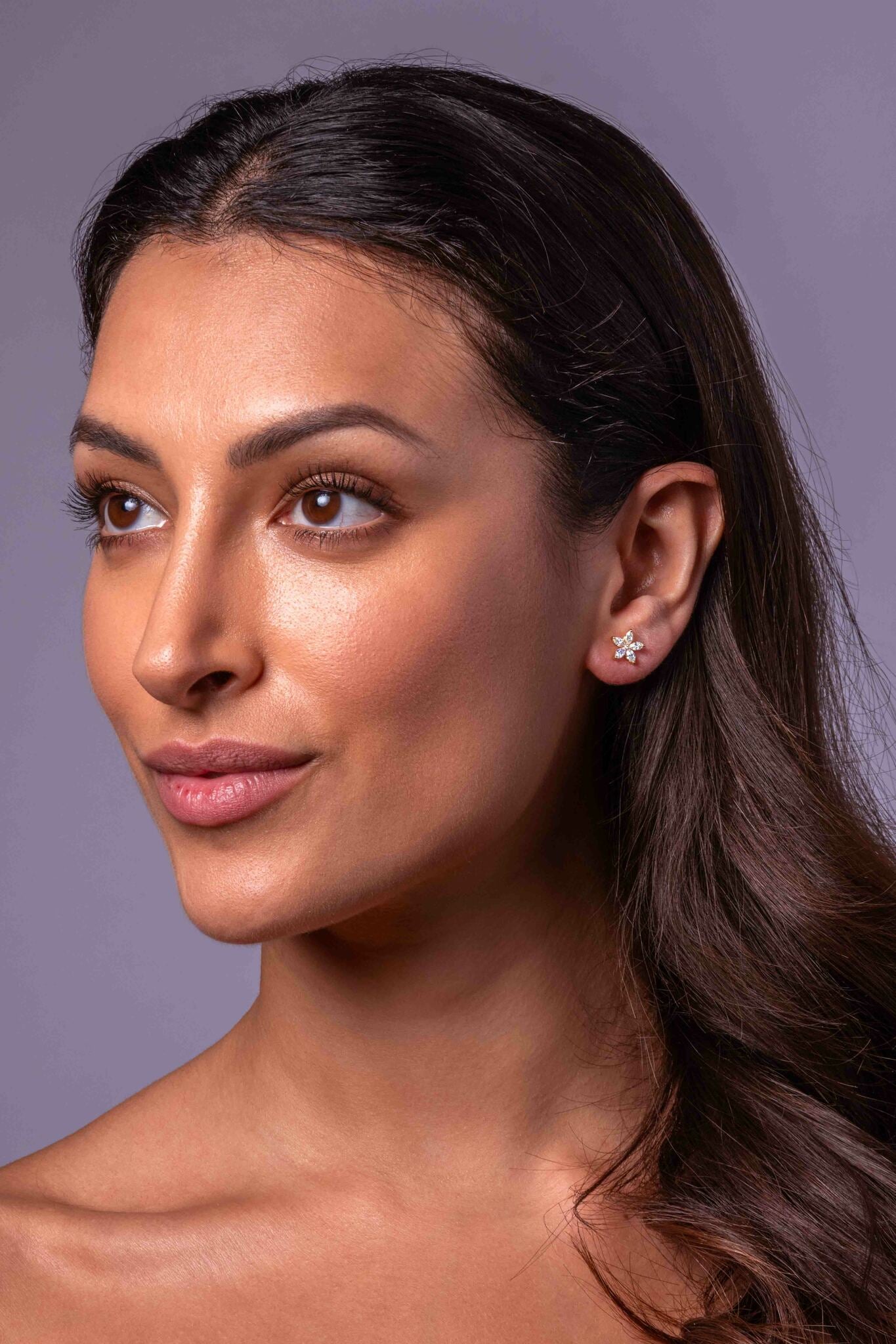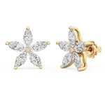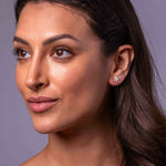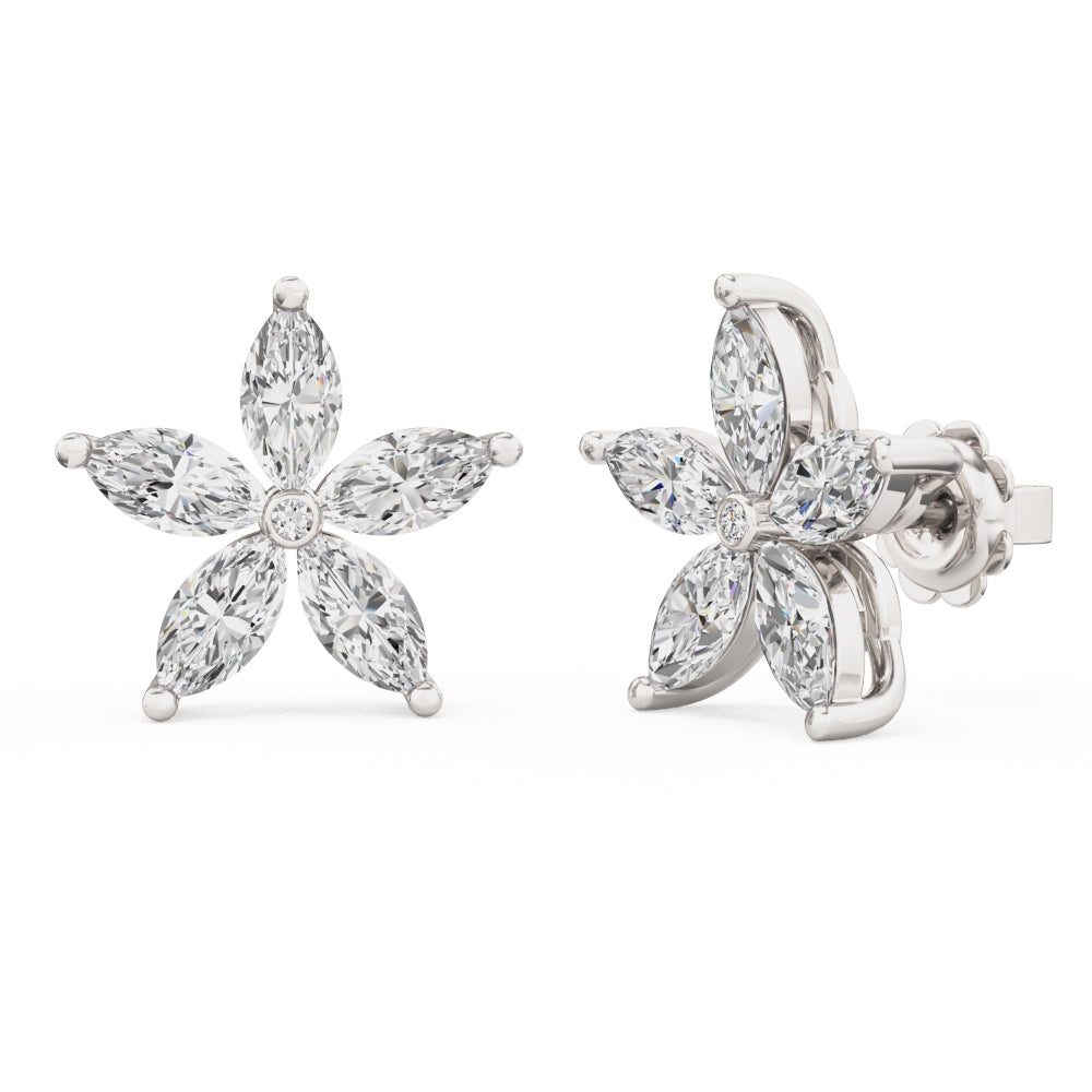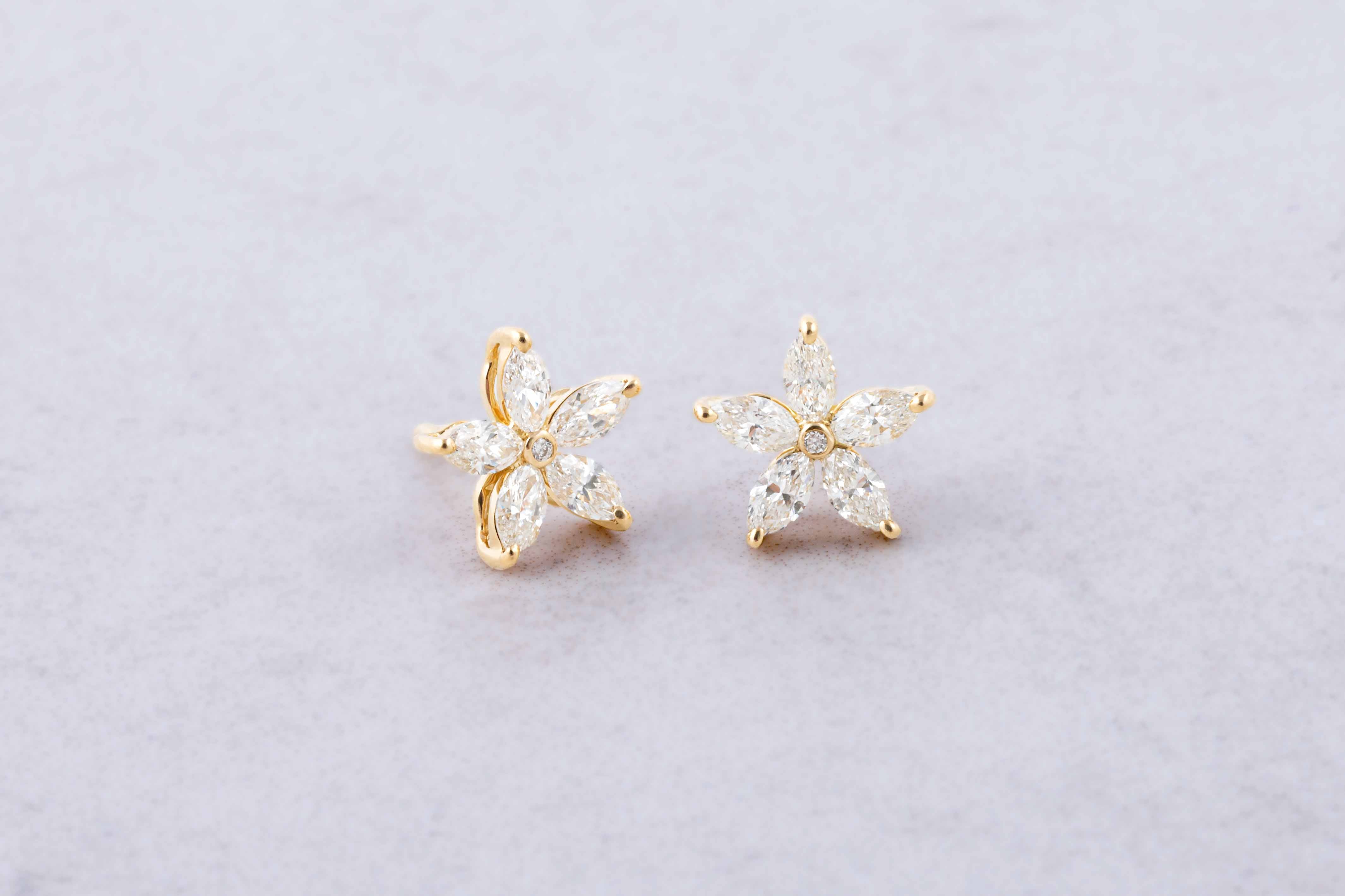 The Mia earrings feature five marquise cut stones with a round rub-over set stone in the centre of each. These stylish stud earrings are perfect for evening wear and pair beautifully with the Madeleine pendant. These earrings can be set with either cubic zirconias or lab grown diamonds and are crafted using 100% recycled 9ct gold.