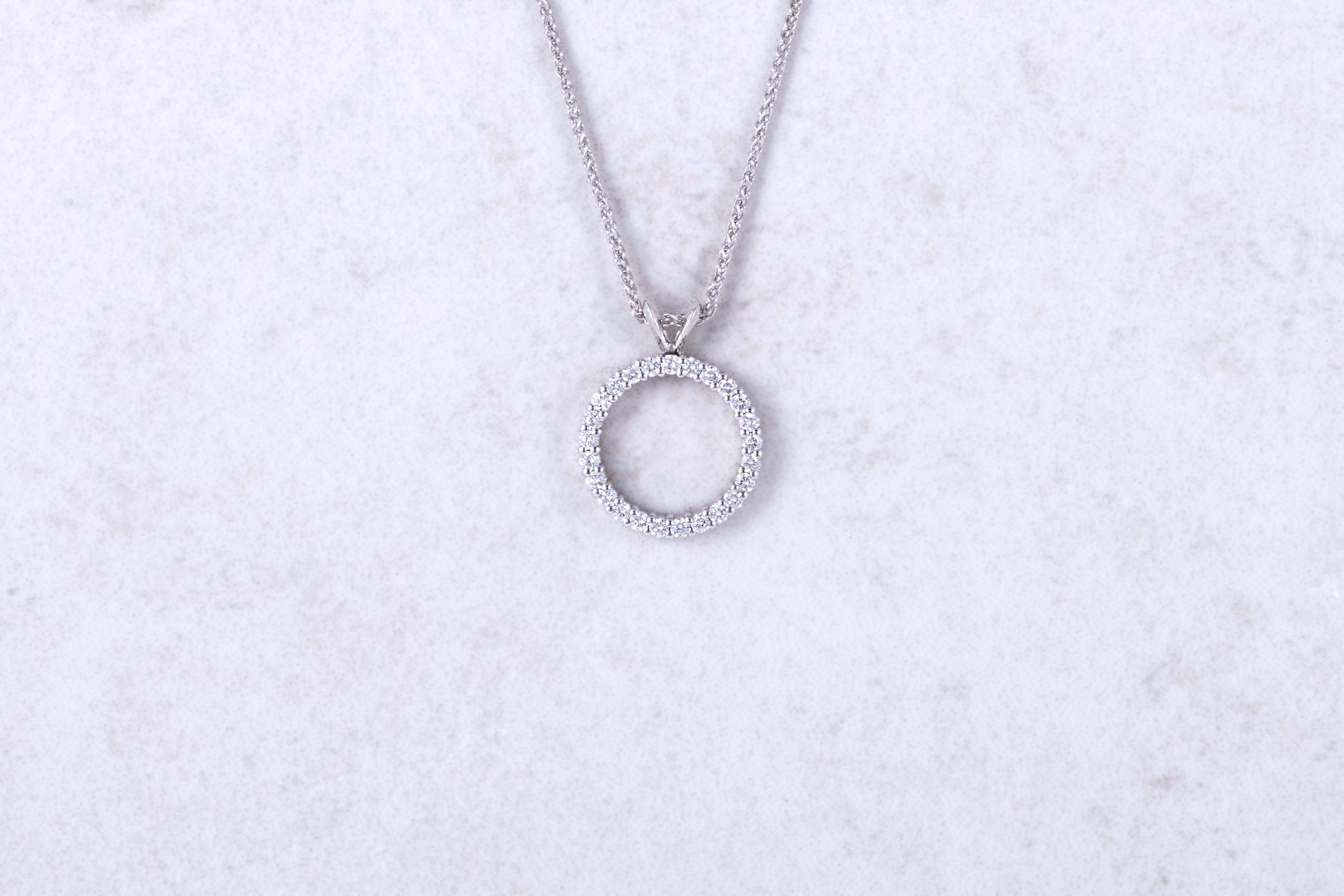 Our Rosanna circle of life pendant features twenty five stones held beautifully in a delicate claw setting and pairs beautifully with the Luna earrings. This pendant is suspended from a spiga or filed curb chain in your preferred length and can be set with either cubic zirconias or lab grown diamonds and is crafted using 100% recycled 9ct gold.